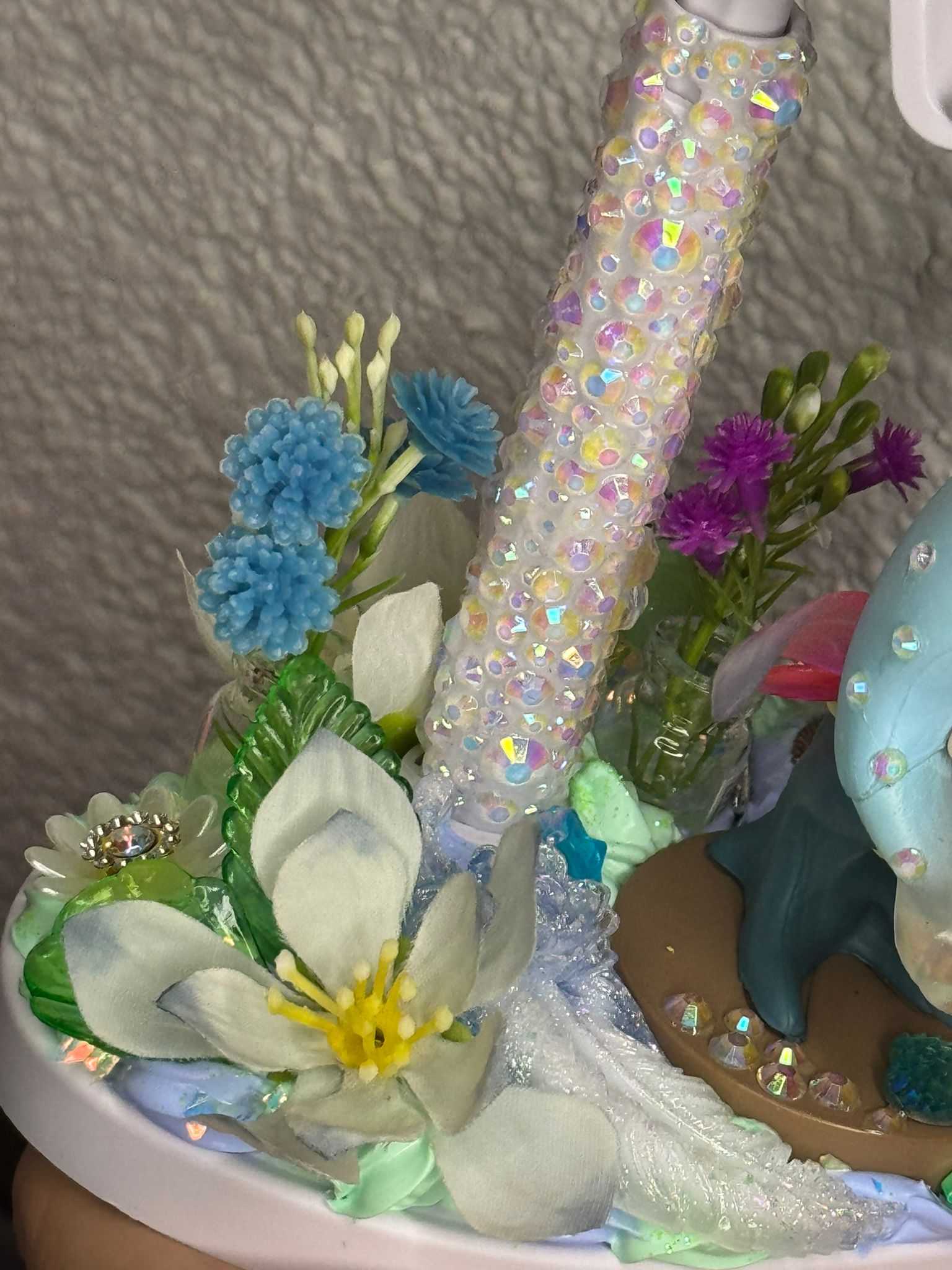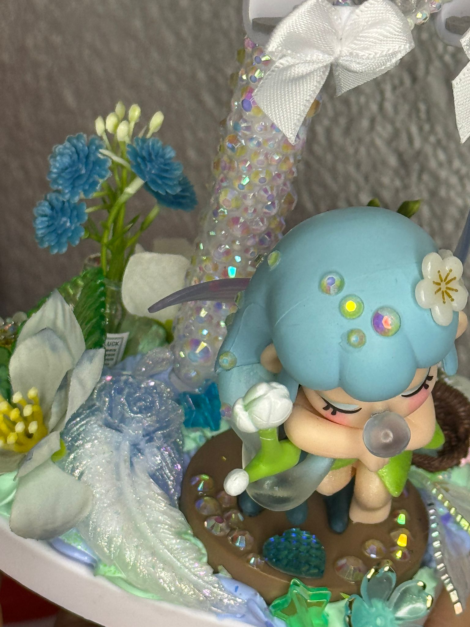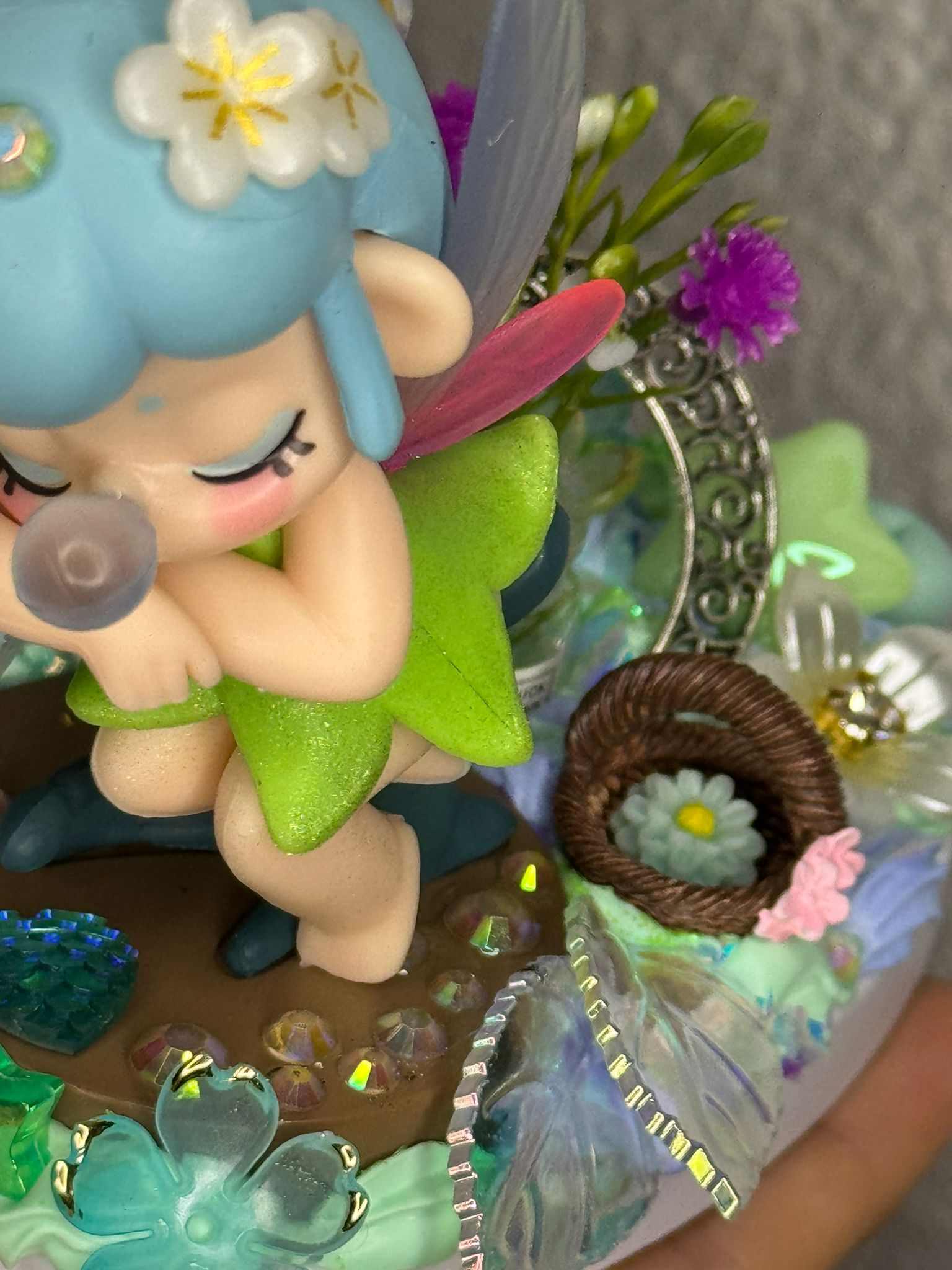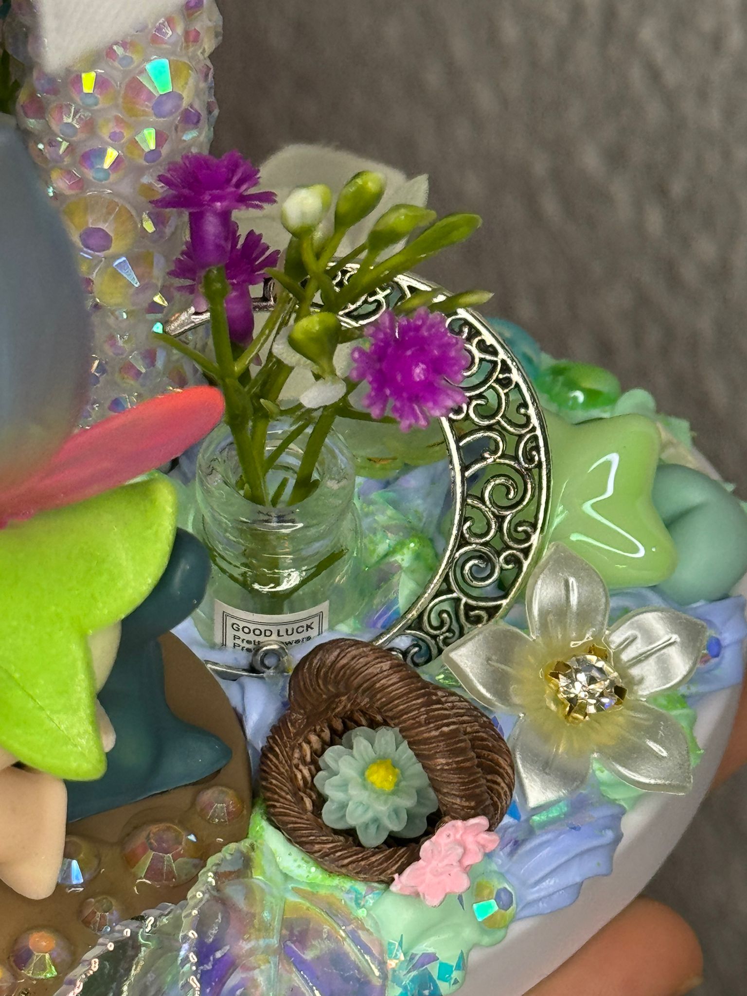 Personalisierter Handyhalter mit 3D Fee, inmitten vieler farblich passenden Details aus Blumen, Herzchen, Sternchen, Mond, Glitzer und Blätter in Glasoptik und holographisch. Der Ständer selber ist mit einzelnen Steinchen bestückt.
