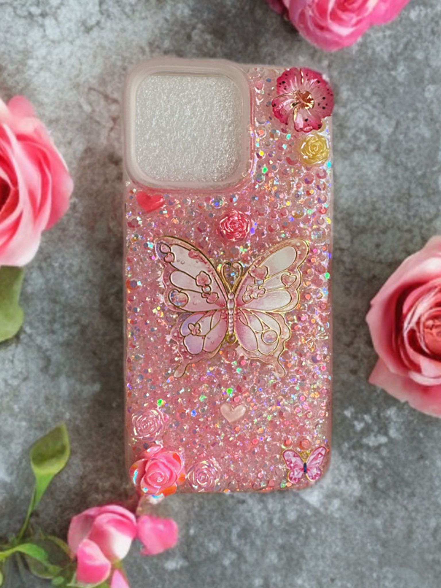 Handverzierte Hülle voller Glitzersteinchen und filigranen Schmetterlingen.