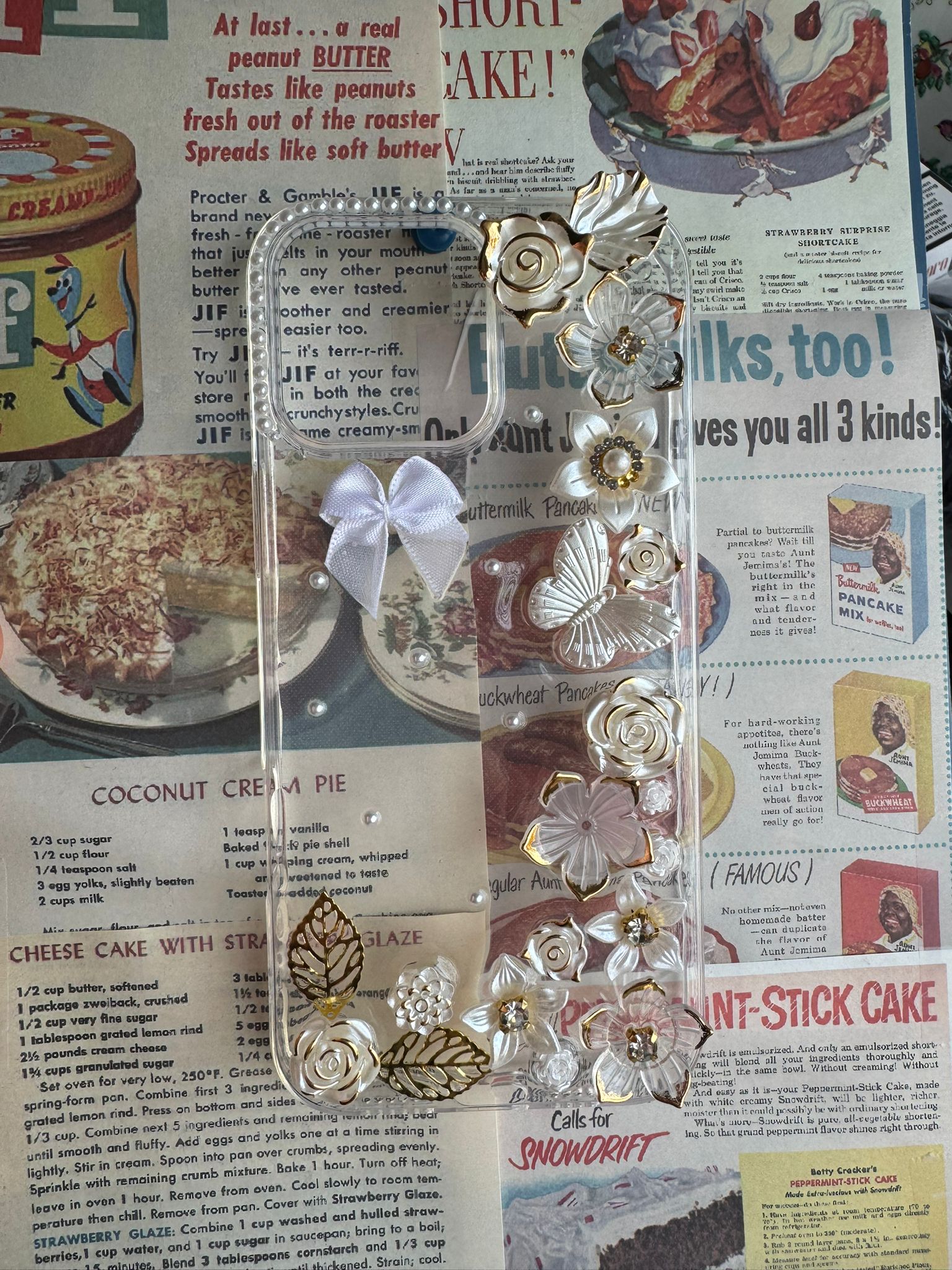 Dezente Blumen in Gold-Weiss Optik auf transparentem Resin mit einzelnen Perlen.
