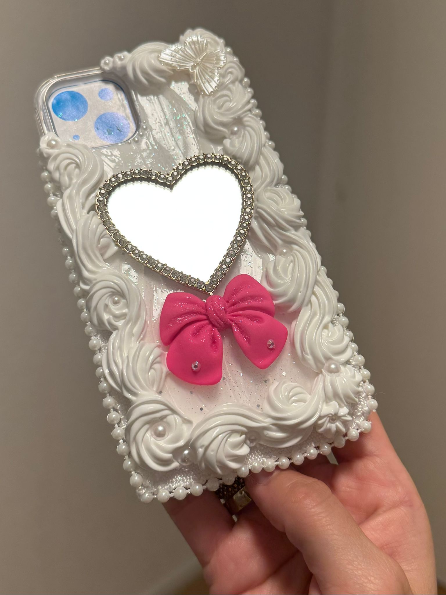 Hochwertige Hülle mit Perlenbordüren, Makeup Spiegel, als Topping ein glitzerndes Gel.